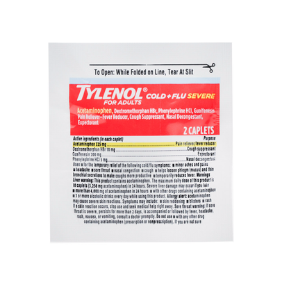 Packed in a dispensing box for easier use in shops and offices or anywhere multiple people may be using the product. The Tylenol Cold and Flu are package in single-use, single-dose, foil packets for easier dispensing and convenience when traveling. 50 pouches of 2 caplets in each tear-open packet.