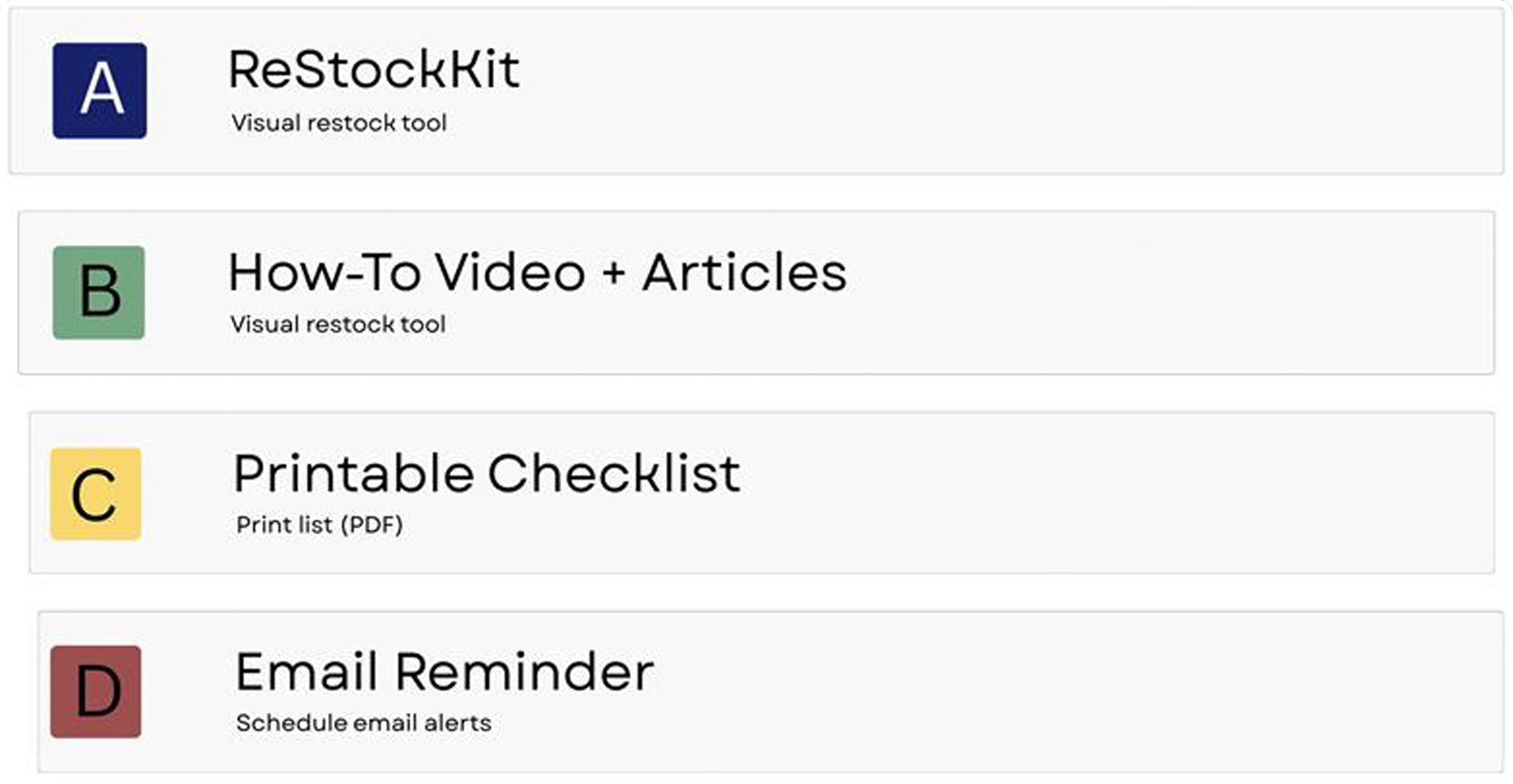 In short, the system is a flexible, branded process, not a locked-in ecosystem. You can manage your first aid cabinet your way, while still benefiting from the tools we created to simplify compliance.