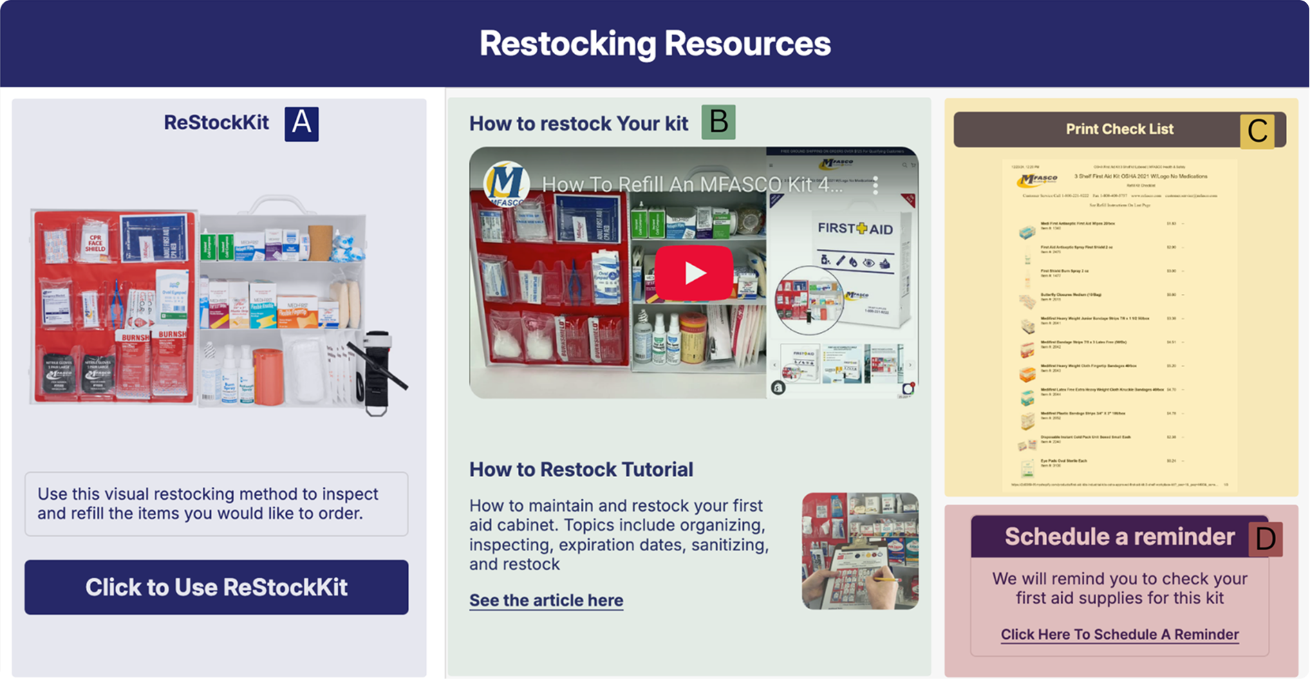 Each MFASCO workplace kit has a matching list of supplies. You can select a completely new kit that includes the box and everything inside the kit, a refill pack that includes all the supplies without the cabinet, or individual items for quick top-offs. The first step is to find the MFASCO kit you want to use as your restock. All of the restock options and resources will be on that product page.